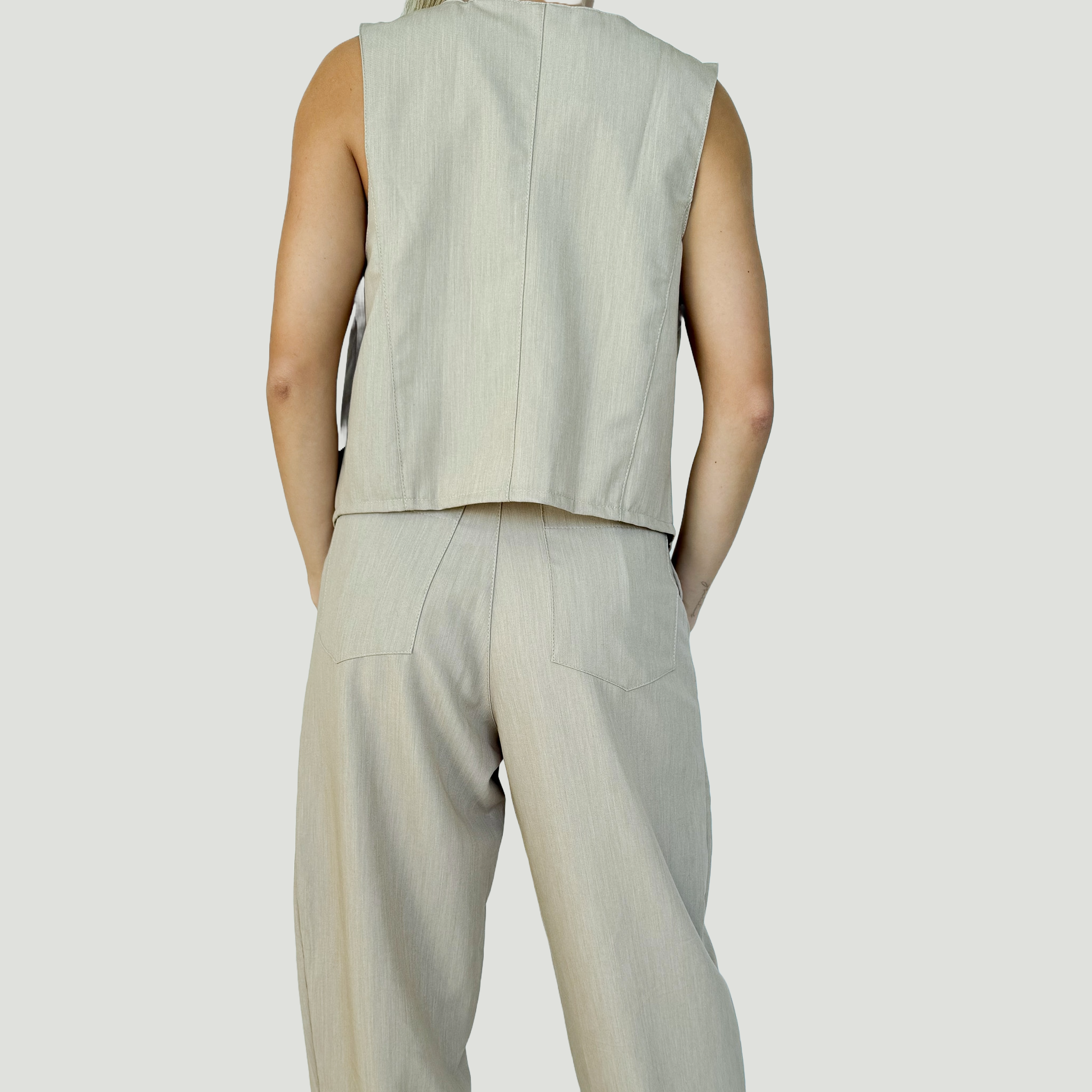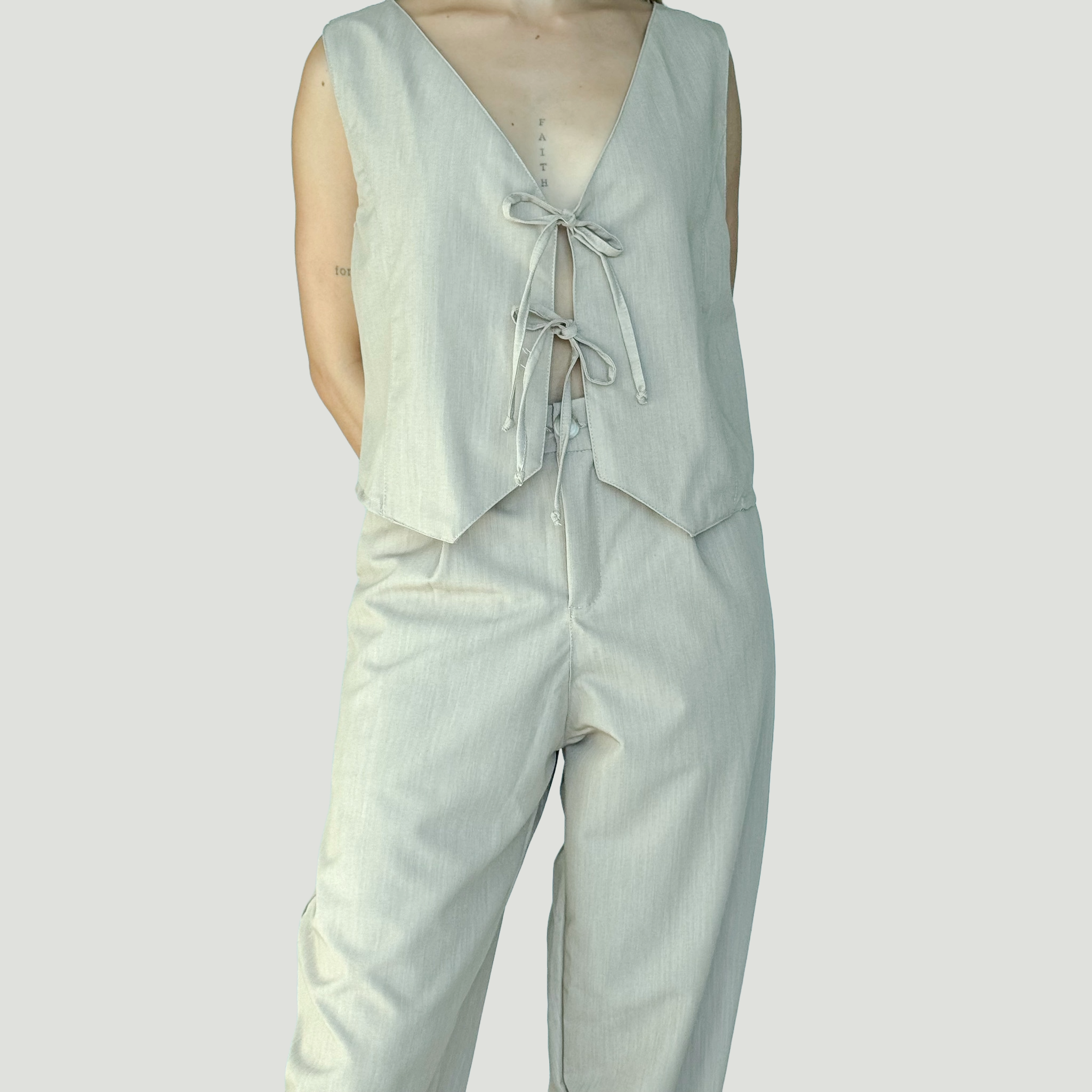 El conjunto Tranquility combina un chaleco con lazo al frente y un pantalón, mostrando un estilo moderno y sutilmente sensual.